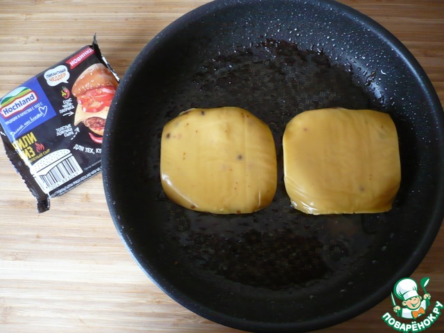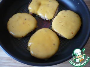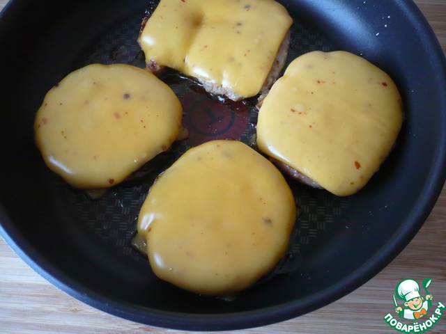 Готовые котлеты переложите на противень или сковороду, поставьте в духовку при температуре 120 градусов и держите в тёплой духовке до сборки чизбургеров (или оставьте котлеты на плите накрыв сковороду крышкой и прикрутив огонь).