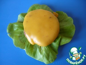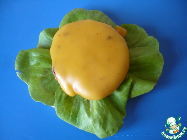 Подавайте по 2 котлеты на булочке с кетчупом, горчицей, солёными огурцами и маринованным перцем халопеньо. Для приготовления чизбургера берем две булочки, аккуратно разрезаем на две части, смазываем кетчупом и горчицей, сверху уложите листья салата, на салат положите теплую котлету с расплавленным сыром.