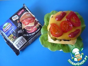 Затем опять ломтик плавленого сыра, полейте кетчупом, накройте чизбургер второй половинкой булочки. И сразу же подавайте к столу.