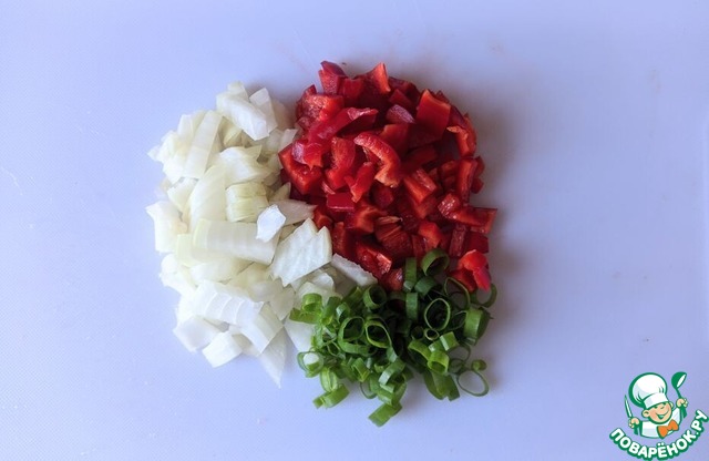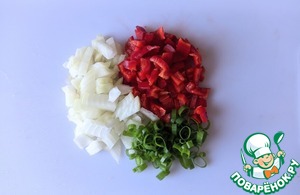 Овощи моем, чистим. Мелкими кубиками режем болгарский перец и лук. Зелёный лук режем колечками.