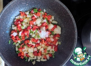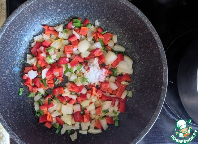 На горячую сковороду наливаем масло, обжариваем на среднем огне пук, перец и зелёный лук около 5 минут. Добавляем соль, перец чили.