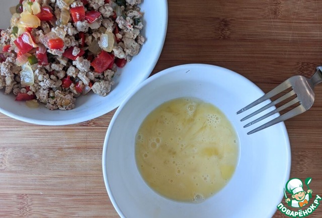 Снимаем с плиты овощи с фаршем. Яйцо взбиваем вилкой. Перемешиваем овощи с фаршем и взбитым яйцом.