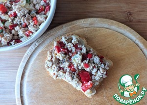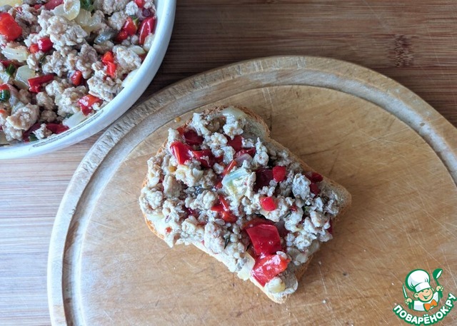 Тостовый хлеб подсушиваем на сковороде-гриль, кладём сверху хлеба начинку (овощи, фарш, яйцо).