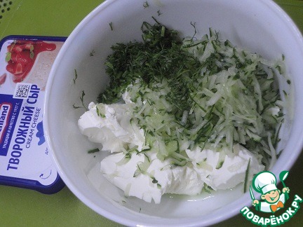 Для намазки творожный сыр смешать с чесноком, нарубленным укропом и натертым на мелкой терке огурцом. Посолить и поперчить по вкусу.