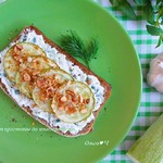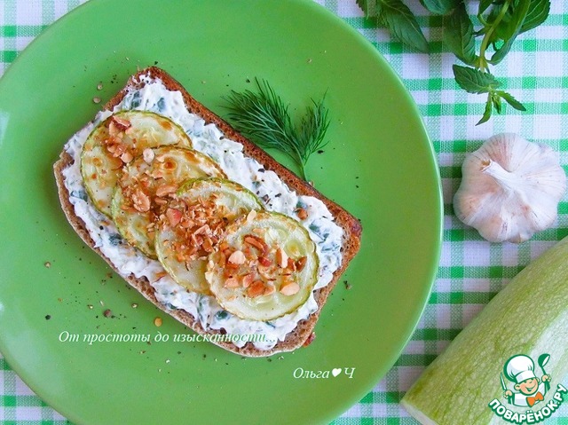 Такая намазка из творожного сыра с зеленью - любимая у моих внучек. Сверху намазку можно покрыть овощами на свой вкус. Сегодня - это кабачки с миндалем. Быстро и вкусно.