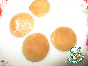 Тесто делим на 5-6 частей, каждую часть скатываем в колбаску, режем на ломтики шириной 1,5см, каждыйломтик скатываем в шарик, диаметром 1,5 см.