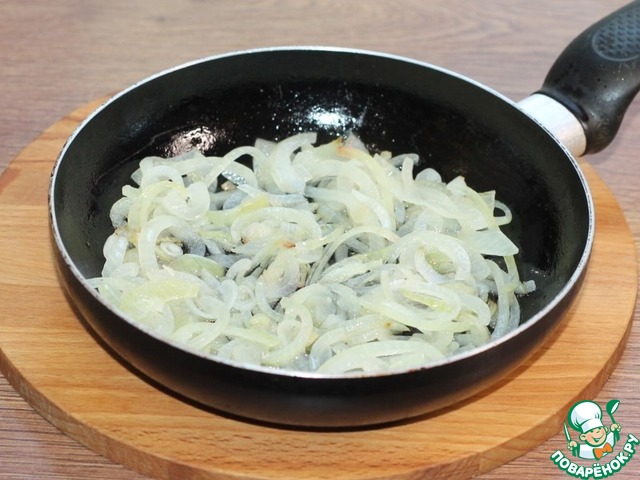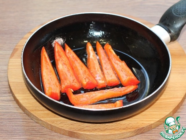 1. Овощи очистить и нарезать: репчатый лук - полукольцами, сладкий перец - дольками. На разогретом растительном масле обжариваем лук до золотистости, минуты 3.