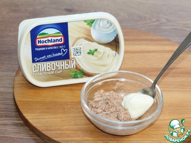 4. У меня тунец салатный с маслом. Выкладываем тунец в сито и удаляем масло. Перекладываем рыбку в миску и смешиваем со сливочным сыром Hochland.