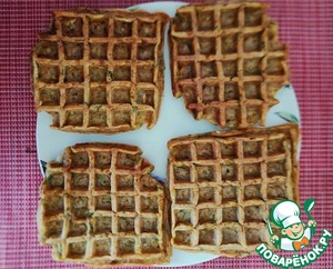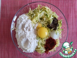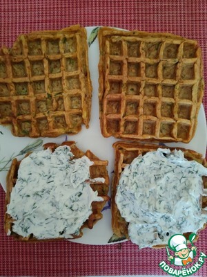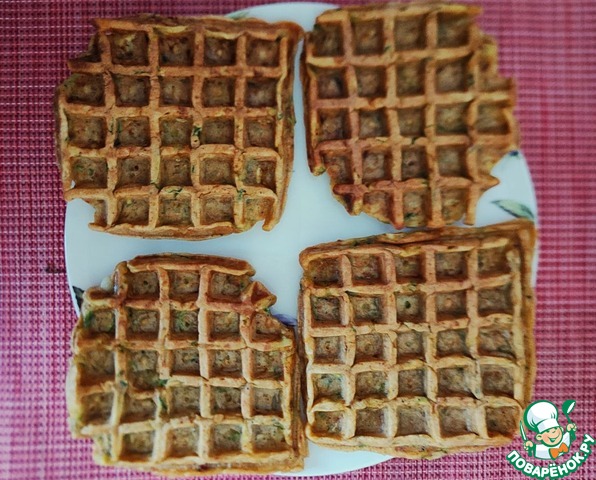 Кабачок натереть на терке. Можно не отжимать. Чеснок тоже натереть. Добавить остальные ингредиенты. Такие вафли могут служить самостоятельным блюдом. Они очень вкусные. При желании специи можно исключить.