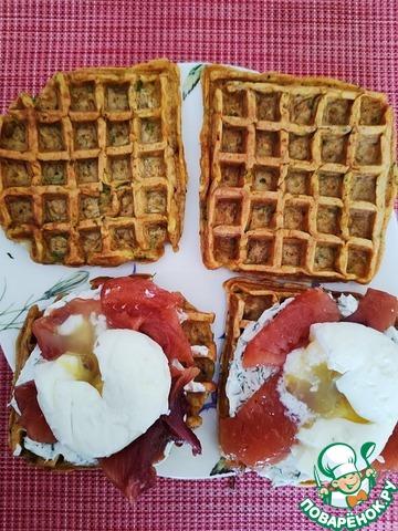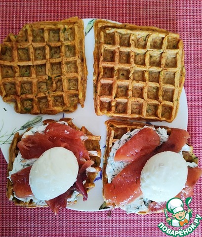 Бургер из кабачковых вафель с рыбой, яйцом и творожным сыром. Очень сытный, сбалансированный и очень вкусный завтрак или перекус.