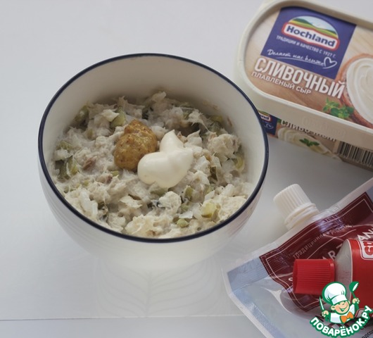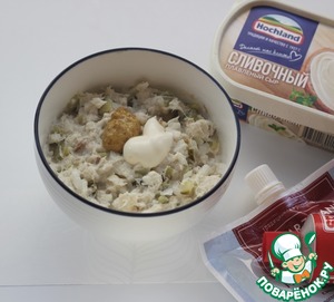 Смешайте в чашке все подготовленные ингредиенты, добавьте по вкусу майонез и горчицу, выровняйте по вкусу. Соль, черный перец на ваше предпочтение.
