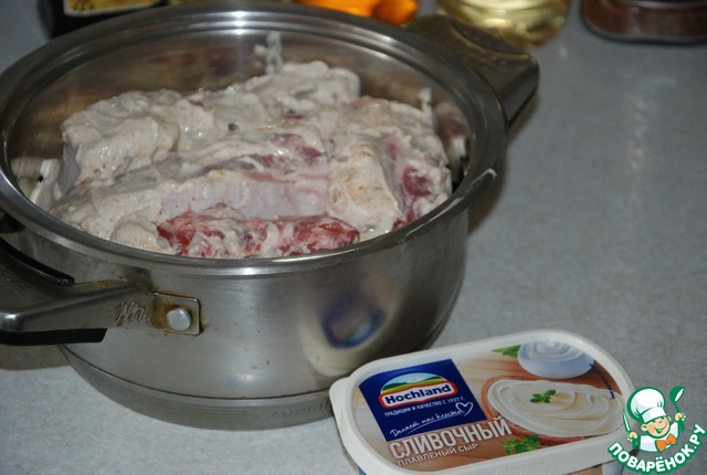 Каждое ребрышко хорошенько обмазываем в сметанно-сырной смеси и выкладываем в кастрюльку. Можно убрать в холодильник помариноваться, а можно сразу приступать к чистке картофеля. Все зависит от наличия времени.