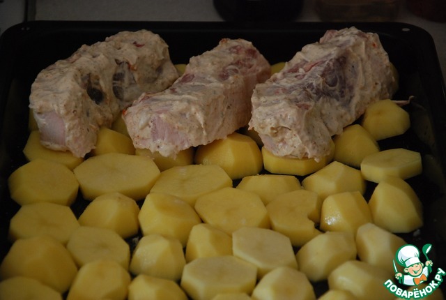 Выкладываем картофель (очищенный) и нарезанный толстыми кружочками (1-1,5 см). Присаливаем картофель и выкладываем ребрышки.