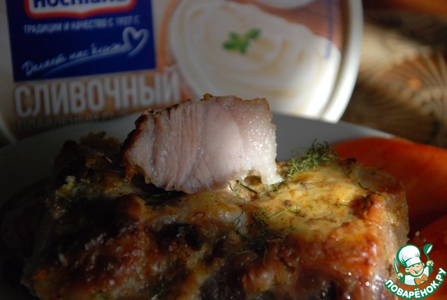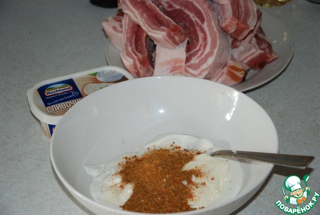 Нарезаем свиные ребрышки на сегменты. Смешиваем ложкой сметану, сыр, соль и специи.