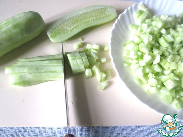 Огурцы вымыть, очистить и нарезать на кусочки. Если семена крупные, то перед нарезкой удалить их с помощью чайной ложки.