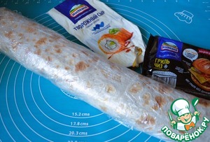Зафиксировать в плёнку. Дать рулету постоять 3-6 часов в холодильнике.