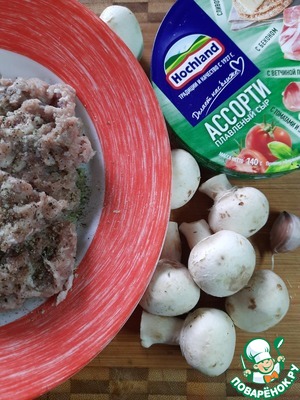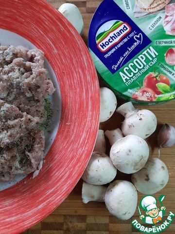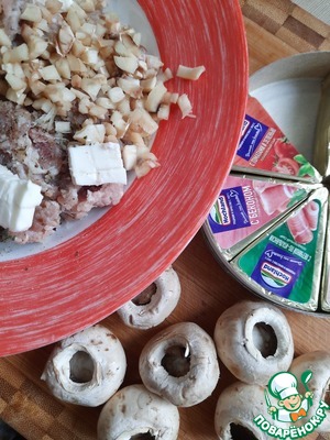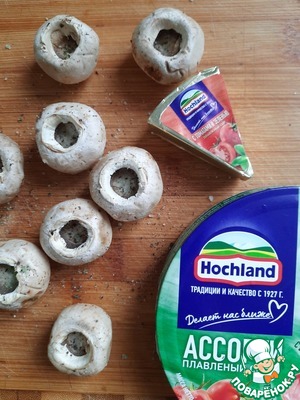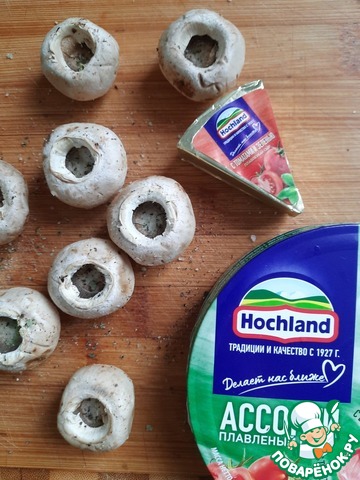 Шляпки шампиньонов посолить, поперчить и в каждую шляпку положить по кусочку плавленного сыра Hochland (я выбрала круг "Ассорти")