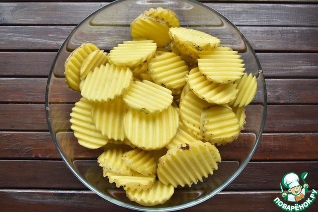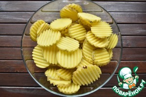Нарезаю клубни шайбами с помощью рифленого ножа. Раскладывают кружочки на противне, выстроенным фольгой.