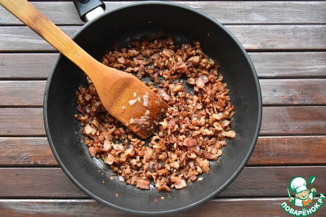 Для соуса чили-кон- карне нарезаю лук, измельчаю чеснок. В сковороде разогреваю оливковое масло и обжариваю лук с чесноком. Добавляю нарезанный кубиками бекон. Обжариваю, помешивая 3-4 минуты и добавляю фарш. Жарю на среднем огне до аппетитной румяности фарша и бекона. Добавляю в чили- кон-карне смолотые в ступке хлопья красного перца и зиру, по вкусу досаливаю.