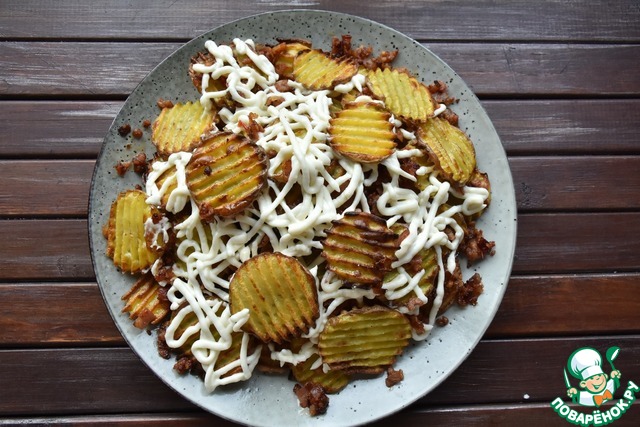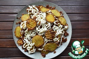 Эта закуска подходит для большой молодежной компании. Готовится она по аналогии с мексиканскими начос, только вместо чипсов подается запеченный картофель. Получается блюдо ералаш. Внешний хаос тщательно организован, сверху картофель заправляется мясным соусом чили-кон-карне, сырным соусом и ставится на середину стола! Такой формат еды вносит непринужденность, сплочает и дарит возможность посмеяться.