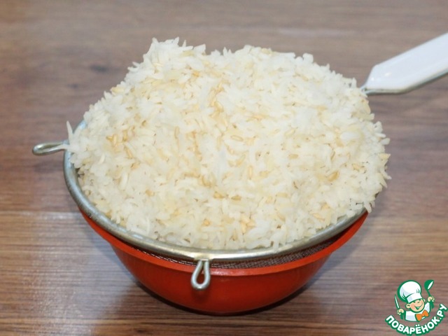 • 1. Отвариваем рис до полуготовности. Воду сливаем через сито.