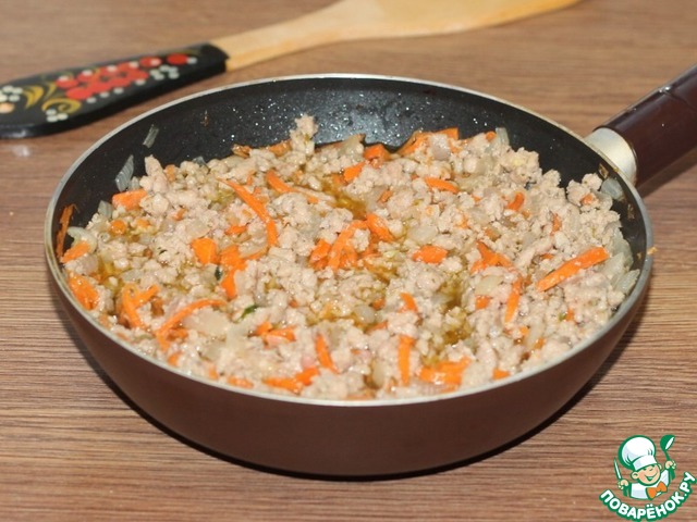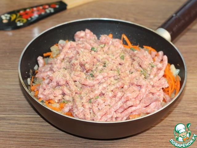 • 4. Затем выкладываем мясной фарш, добавляем приправу для мяса, солим и перчим,...