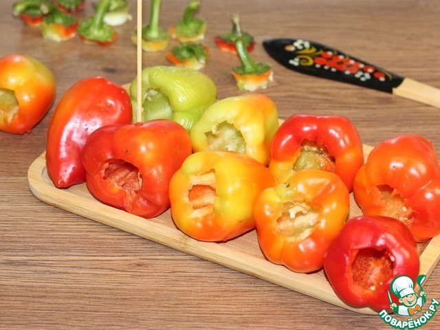 • 8. Вырезаем хвостик и очищаем перец от семечек и сердцевины.