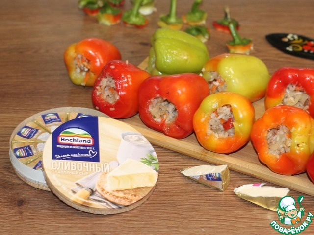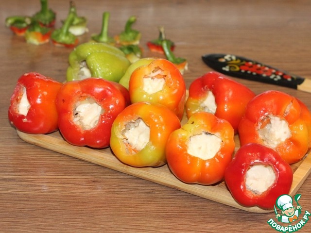 • 10. Вкладываем половинку сыра в каждый перчик, затем добавляем до края начинку.