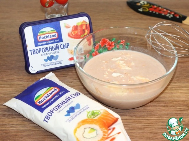 • 13. Приготовим соус. Смешиваем молоко, творожный сыр и томатную пасту (или кетчуп). Солим и перчим, взбиваем венчиком. Можно добавить щепотку сахара.