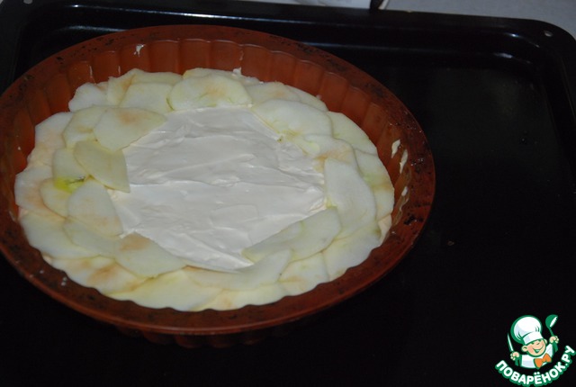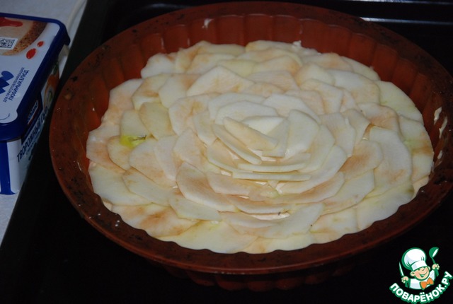 • Выложить начинку в центр пирога, отступая от краев 1,5 см. Очищенные от кожи яблоки нарезаем тонкими слайсами и выкладываем внахлест по спирали от краев к центру.