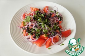 Красный лук тонко порезать, присолить, слегка помять. Листики зелени порубить крупно. Выложить лук и зелень на помидоры.