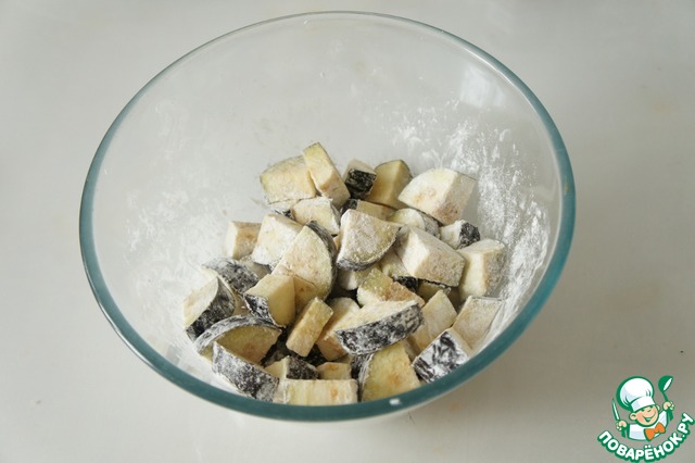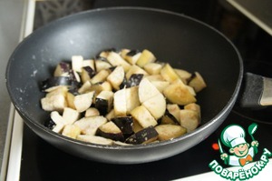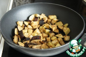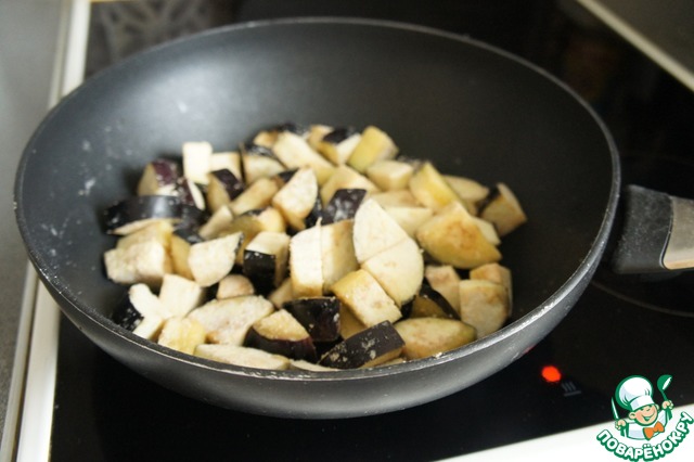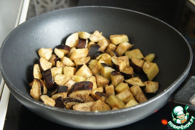Обжарить баклажаны на масле в хорошо разогретой глубокой сковороде. Лучше вок, но можно и просто в сотейнике, тогда удобнее партиями.