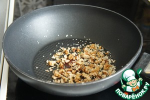 Вынуть баклажаны. На сковороду отправить рубленые орехи и кунжут. Выключить огонь.