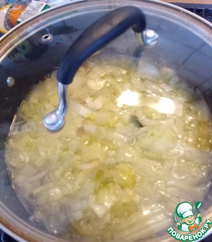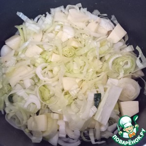 В казане на растительном масле томить лук-порей, репчатый лук и картофель 3-4 минуты.