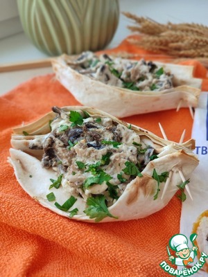 Из лаваша формируем лодочки, скрепляя концы зубочистками крест на крест.