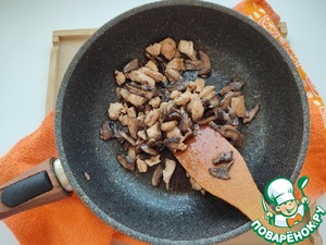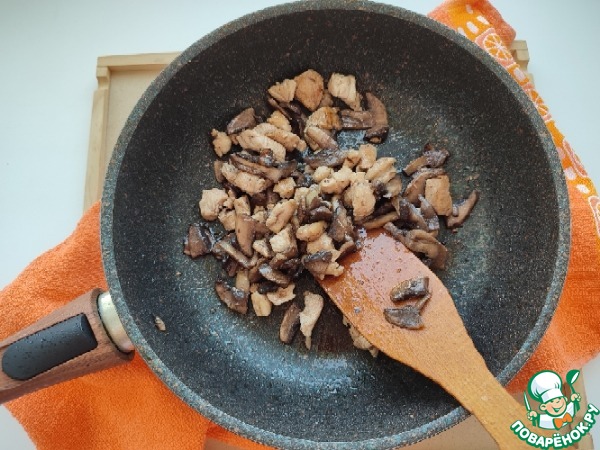 Добавляем туда грибы и так же быстро обжариваем до выпаривания лишней жидкости.