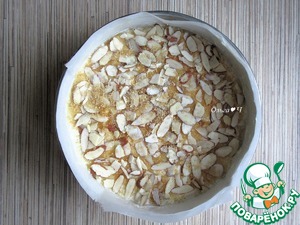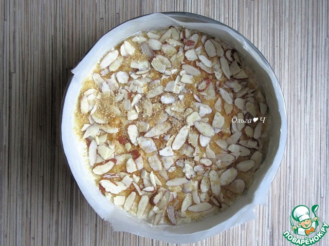 Выложите яблочно-творожную массу в форму (17-20 см диаметром), застеленную бумагой для выпечки, хорошо прижимая, чтобы не осталось пустот между яблоками. Сверху посыпьте оставшимся коричневым сахаром и миндальными лепестками.