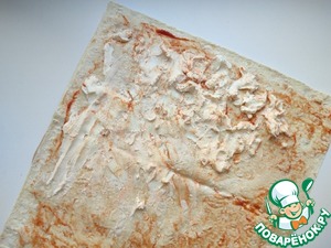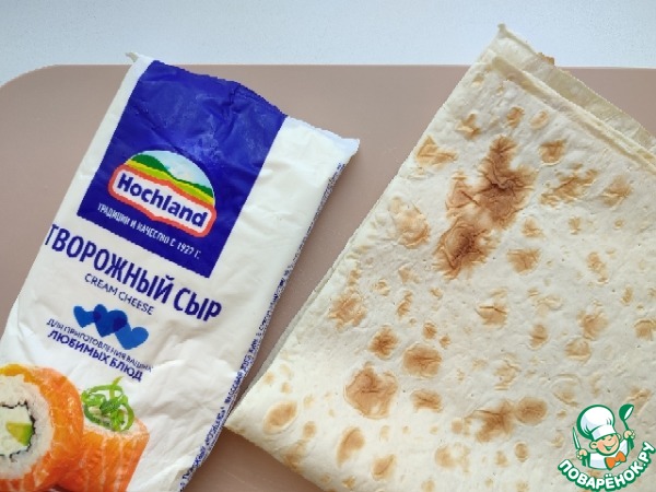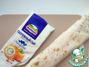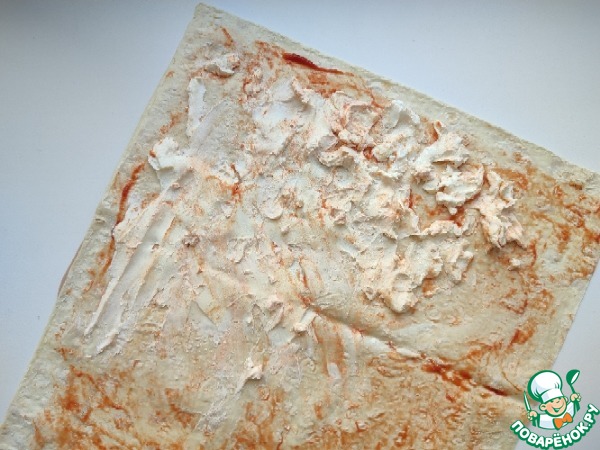 Лаваш (я заворачиваю и промазываю его по диагонали) смазываем кетчупом, поверх выкладываем творожный сыр.
