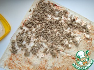 Следующим добавляем фарш. И фарш, и сыр я выкладываю только на половину лаваша.