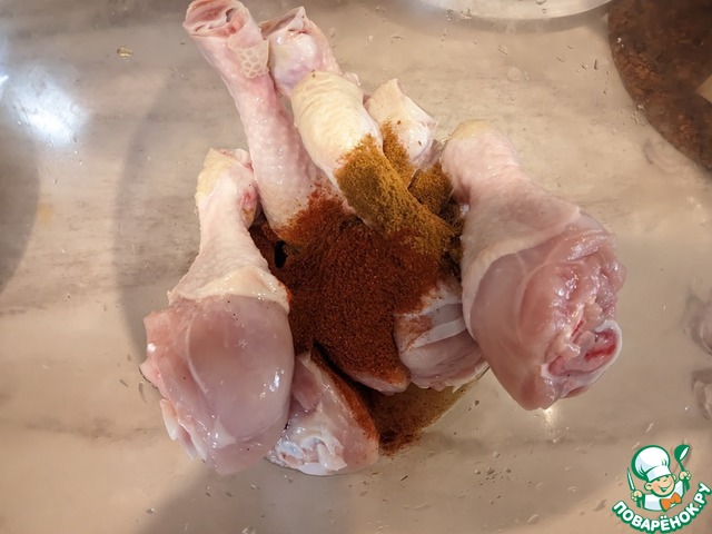 Возьмите куриные голени, добавьте соль, паприку и приправу.