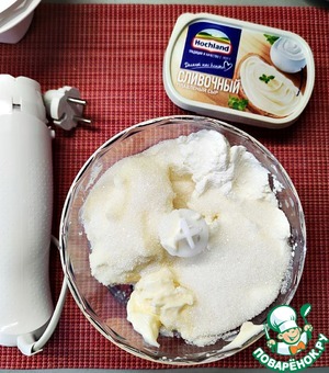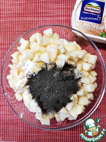 Соединить творог с плавленым сыром. Сыр Сливочный ТМ Hochland оправдывает свое название. С ним начинка получается очень нежной со сливочным вкусом. Творог с сыром пробить в миксере до кремового состояния