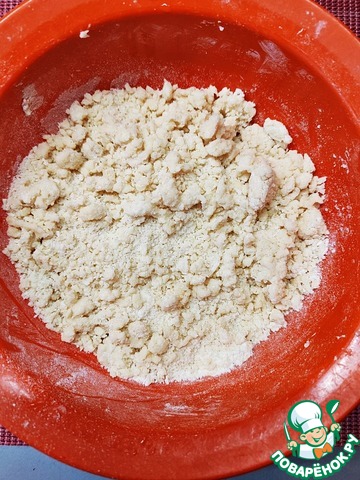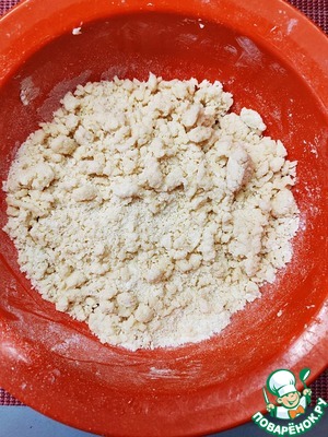 Смешать сухие ингредиенты для теста, добавить яйцо и масло, порезанное кубиками.