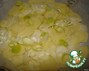 Картофель сырой режем пластиками и выкладываем не очень толстым слоем в форму... сверху посыпаем резаным луком...