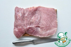 Что бы нарезать кусок мяса на рулет, делаю разрез по центру куска не до конца.