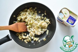 В капусту добавляю щедрых пару столовых ложек сливочного плавленного сыра Hochland. Солю перчу, перемешиваю начинку и снимаю с огня.