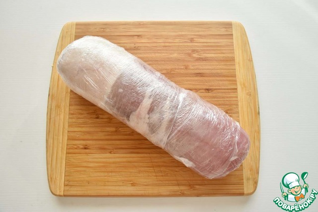 Аккуратно сворачиваю мясо в плотный рулет и оборачиваю его пищевой пленкой. Оставляю руле отлежаться часок в холодильнике, после чего снимаю с него пленку.