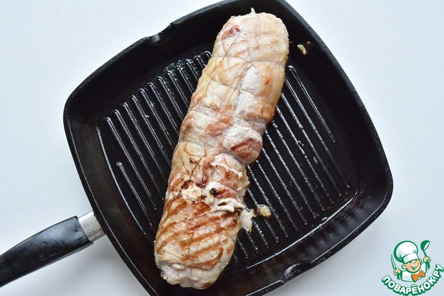 Разогреваю гриль и на сильном огне обжариваю рулет со всех сторон до румяности и переношу мясо на противень.