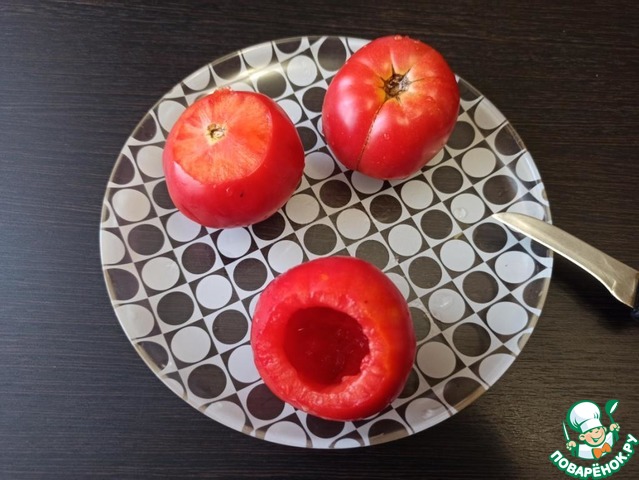• У помидоров аккуратно срезать верхушку и удалить семена, сок и перегородки.