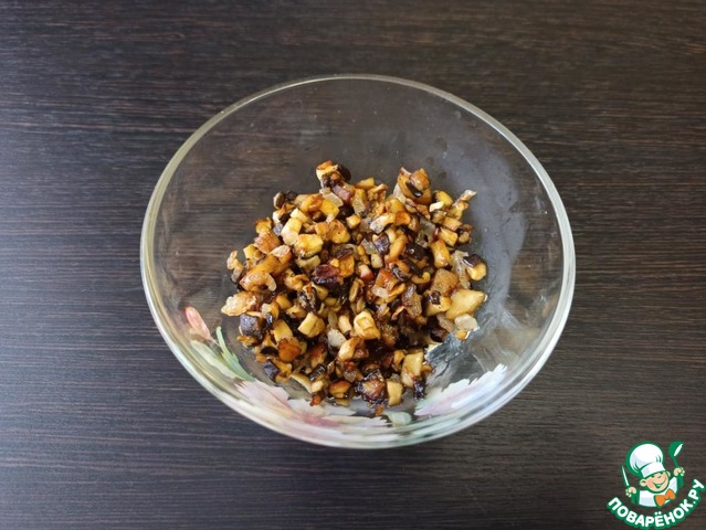 • Подготовить ингредиенты. Белые грибы и лук нарезать мелким кубиком, чеснок через пресс. Обжарить на смеси сливочного и растительного масел до мягкости.
