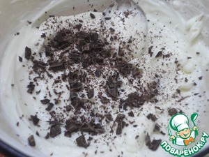 Творожный сыр со сливками и сахаром взбейте, добавьте рубленый шоколад и осторожно перемешайте.